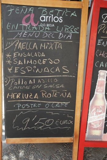 Un restau (Pena Betica) très sympa à coté de l’église santa Maria la blanca dans la rue du même nom sur une petite place très ombragée par les mandariniers très agréables avec très souvent des musiciens ( guitaristes ) il régné une ambiance très sympa.Dans cette même rue plusieurs restos font des prix allant dans une fourchette de 9,50 à 13 € ce n’est toutefois pas une cuisine gastronomique…