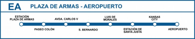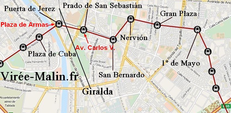 Voila les arrêts sur ce plan GoogleMap – Rejoindre Séville depuis l’aéroport: