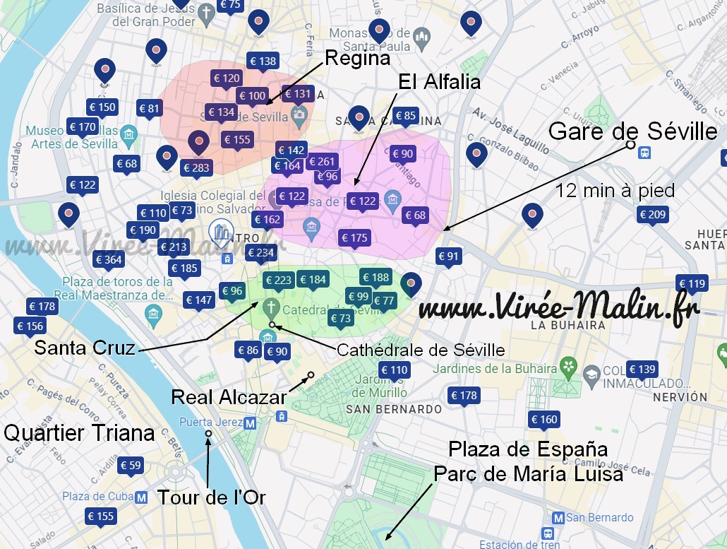 - Sur cette carte, je vous propose 3 quartiers pour se loger à Séville, la zone orange et verte sont des quartiers très vivants, la zone violette est donc un bon compromis et il est à seulement 12 min de la gare à pied.