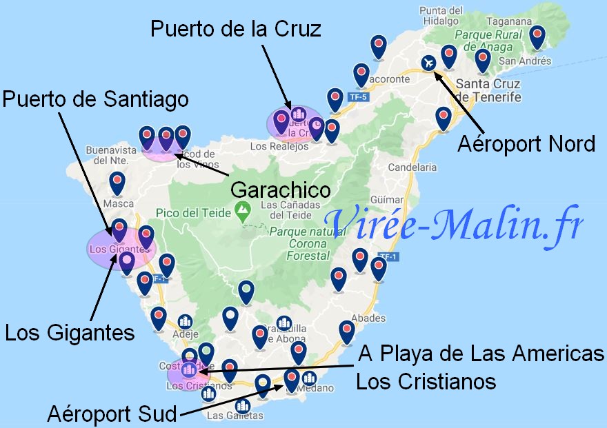 Voici une GoogleMap de l’île de Tenerife avec les 2 aéroports Nord et Sud, et les principales zones hôtelières.
