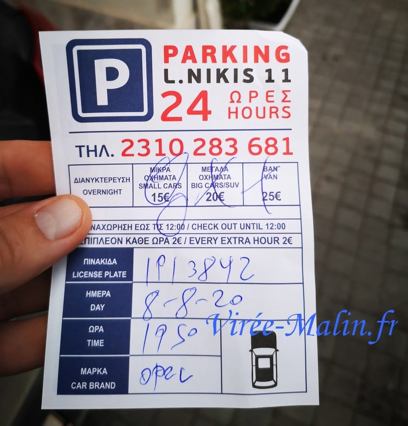 Cela dit, à 3 minutes à pied (vraiment juste à côté), vous avez le « Parking Lot Kasapidis Athanasios » qui est idéalement situé et se trouve ici (lien GoogleMap), je vous en ai mis un autre qui se trouve juste à côté, au cas où il n’y aurait plus de places (il s’appelle le Parking P24).