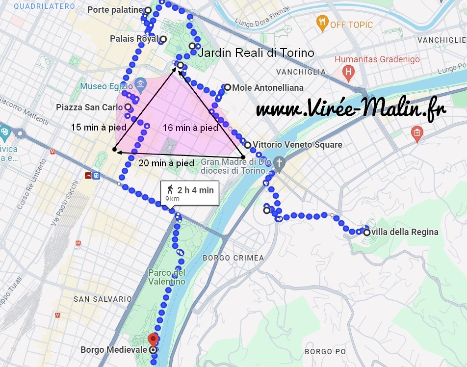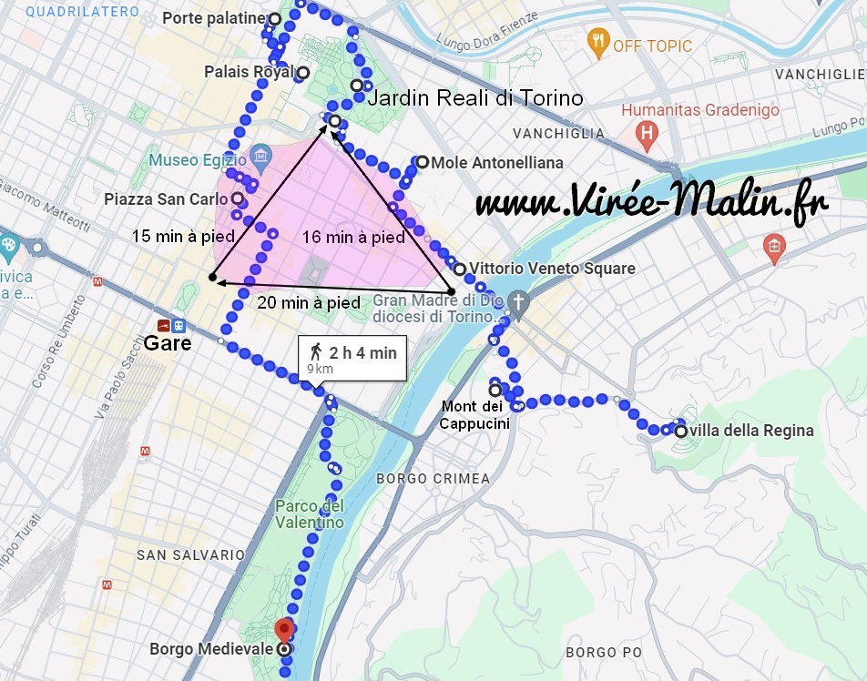 Encore une fois c’est entre le Jardin Reali di Torino, Vittorio Veneto Square et la Piazza San Carlo (cela forme un triangle) que je vous conseille de dormir à Turin, idéalement 3 nuits, c’est suffisant. Dans cette zone, que j’ai mis en violet sur la carte ci-dessous, vous serez bien placé pour visiter la ville et sortir le soir.