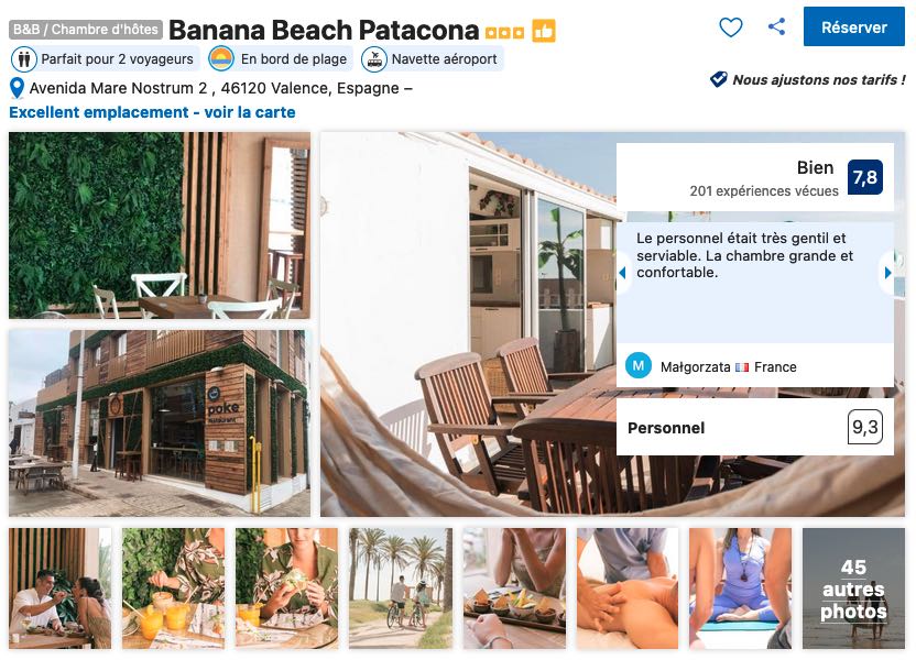 À l’extrémité nord de la plage de Malvarrosa se trouve le Banana Beach Patacona qui vous offre une des plus belles vues sur la mer et un emplacement incroyable à moins de cent mètres du sable chaud. Pour une centaine d’euros en plein mois de Juillet ou Août, cette maison d’hôtes vous propose un hébergement pratiquement les pieds dans l’eau avec une terrasse où vous pourrez siroter un verre face à l’océan.