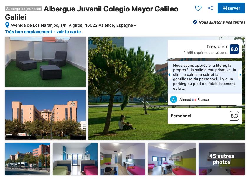 Et comment ne pas penser auberge espagnole et séjour à Valence ? Pour les amateurs de ce type d’hébergement, l’auberge Mayor Galiléo Galiléi à 700 mètres de la plage de Malvarrosa vous propose tout le confort moderne et de nombreux services pour seulement 49 euros le logement pour deux personnes en pleine période estivale.