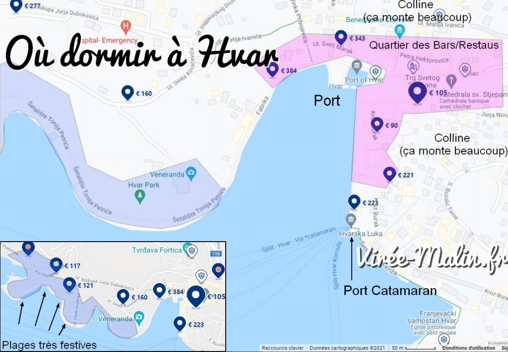 Pour ceux qui me font déjà confiance voilà une carte qui vous permet de voir où loger dans la ville de Hvar (et non dans la ville de Stari Grad). La zone bleue c’est le côté mer (c’est aussi dans cette zone que vous pourrez vous baigner avec des prestations bling-bling…) et la zone violette c’est dans le port (plus authentique je dirai). Dans la zone violette je vous conseillerai le Inn Town Center ou le Vintage House. et dans la zone bleue je vous conseille l’hôtel Croatia.