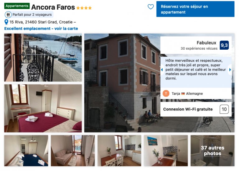 Il n’existe aucun hôtel dans le centre de Stari Grad, vous devrez donc réserver votre séjour dans un appartement, et je vous recommande l’Ancora Faros qui propose une vue splendide sur le front de mer et le port de plaisance.