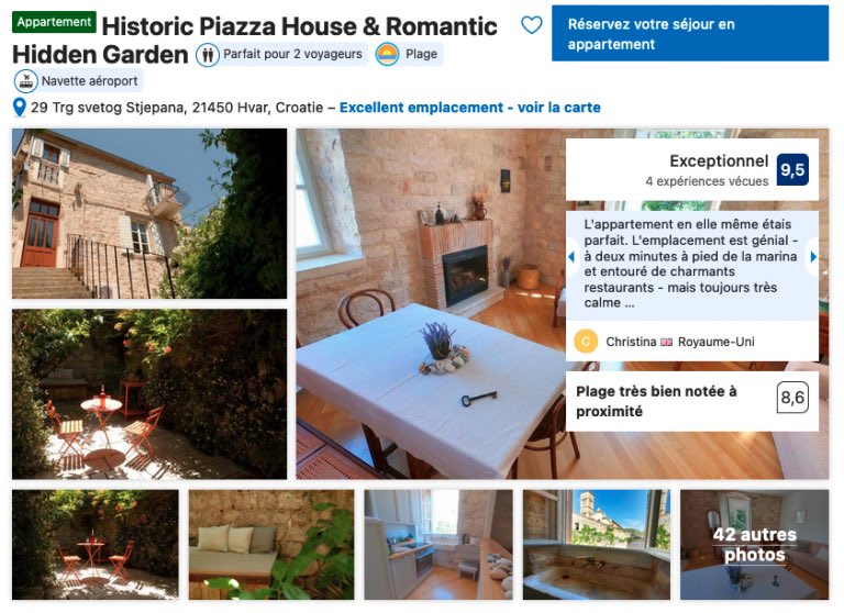 Si vous êtes à la recherche d’un appartement, et pour ne pas vous laisser attraper par des pièges ou arnaques, je vous recommande de loger à l’Historic Piazza House & Romantic Hidden Garden dans le centre de Hvar.