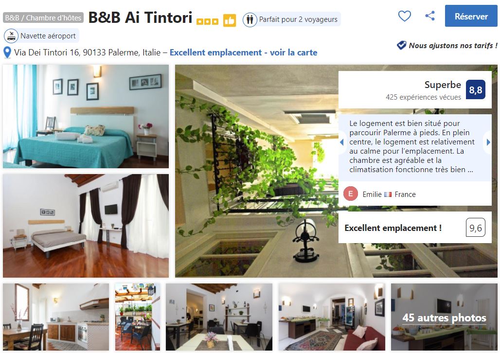 Pour cela, je vous conseille de passer vos deux nuits à Palerme dans le quartier historique de Palerme avec une vue sur le port de plaisance, le B&B Ai Tintori vous donne le choix de loger dans une chambre, une suite ou un appartement d’une à plusieurs personnes pour un tarif très abordable, à partir de 65 euros petits déjeuners inclus.