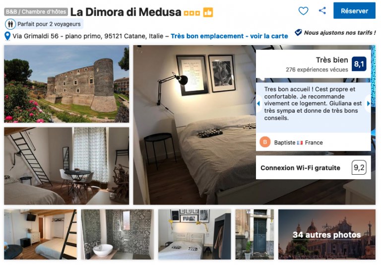 C’est la même chose pour La Dimora di Medusa qui propose fréquemment ses chambres à moitié prix, soit moins de 50 euros pour une chambre tout confort à deux pas du château d’Ursino et 500 mètres du centre de Catane et des tavernes et restaurants siciliens.