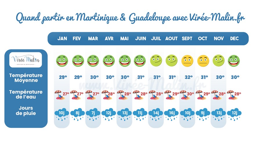 Dans cette région du globe, le climat tropical qui règne dans ces îles permet de profiter de températures entre 25 et 30 degrés avec peu de risques de pluie. Les touristes étant plus nombreux à partir à la neige à cette période, les tarifs sont très accessibles : faites-vous une idée par vous-même !