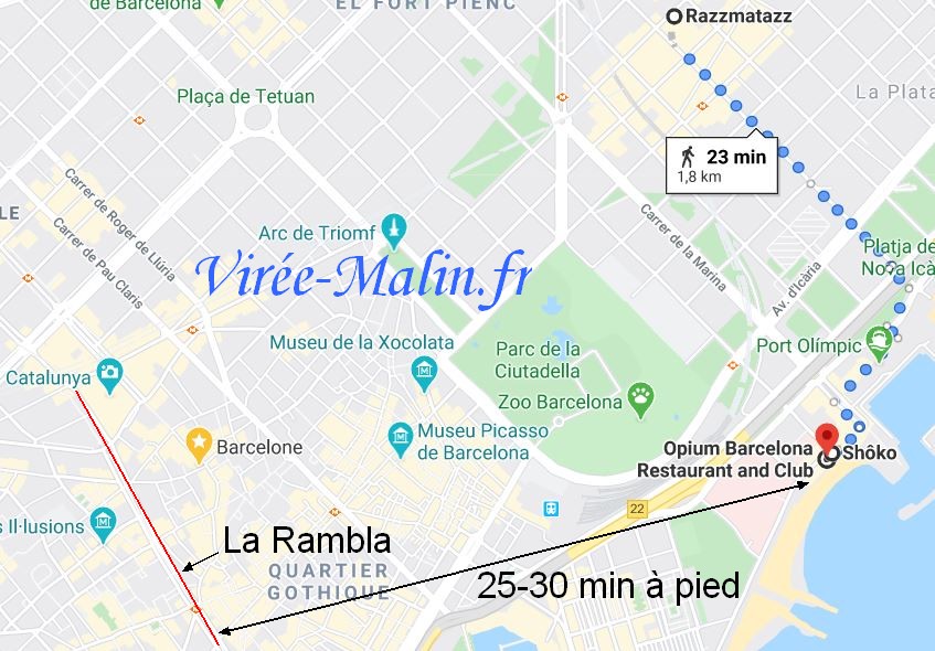 Le CDLC, l’Ecplise, l’Opium, le Shoko, le Sutton, le Danzatoria, le Smalls Club, le Razzmatazz. Cliquez ici pour agrandir la GoogleMap – Boite de nuit Barcelone.