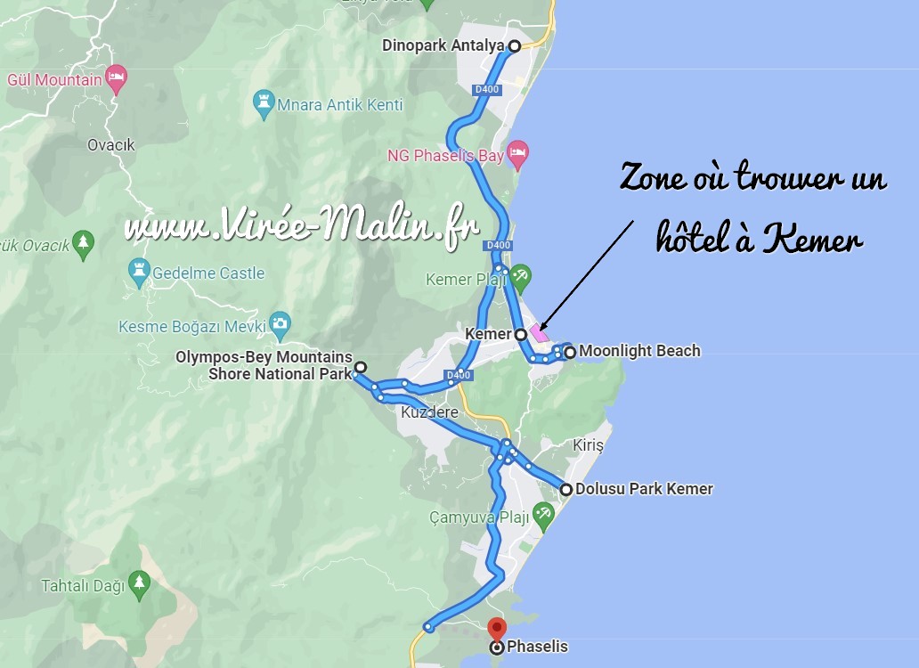 Pour les plus pressés et ceux qui me font déjà confiance c’est dans la zone violette que je vous conseille de loger à Kemer, vous serez idéalement placé pour profiter de cette cité balnéaire.