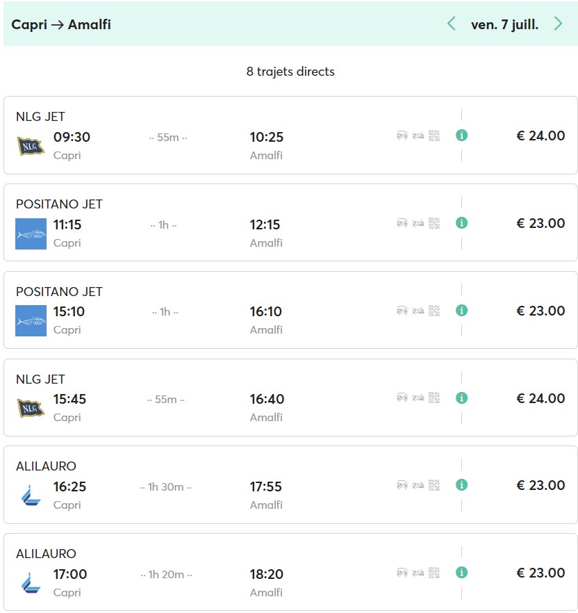 2) Le prix des billets de bateau depuis Capri vers Amalfi