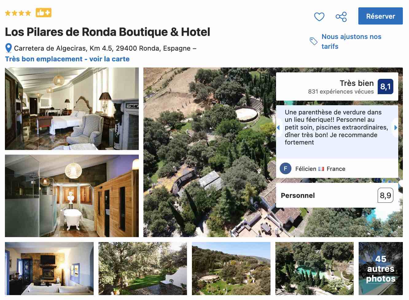 Pour cette ultime étape avant de reprendre la route vers Malaga, je vous recommande de poser vos valises et de garer votre voiture à Los Pilares de Ronda. Un boutique-hôtel tout confort situé en plein cœur d’une forêt de plus de 1000 hectares. Vous pourrez profiter de l’ambiance atypique des lieux entre ranch de western andalou et hôtel haut de gamme.
