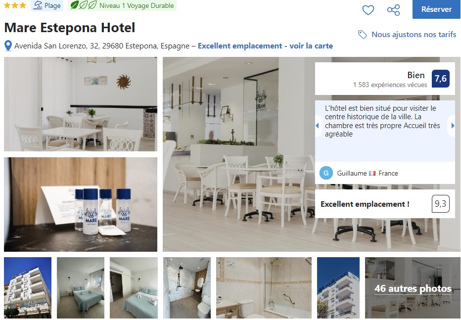 Si vous cherchez un logement dans le coeur d’Estepona et donc proche des restaurants, des bars et de la plage alors je vous conseille l’hôtel Mare Estepona qui propose des chambres avec un bon rapport qualité/prix en plus d’avoir un emplacement idéal (de plus le parking qui se trouve à proximité est vraiment pas cher).