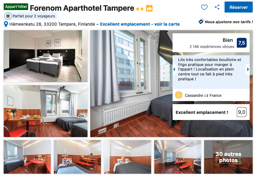 Dans cette optique, je vous recommande de dormir à Tampere au Forenom Aparthotel Tampere dans lequel vous pouvez trouver des promotions sur le prix des chambres, jusqu’à 70 euros la nuit pour deux ou trois personnes.