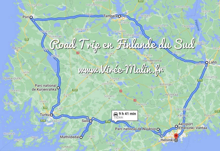 - Cliquez ici pour agrandir cette GoogleMap – Circuit en voiture pour visiter la Finlande du Sud :