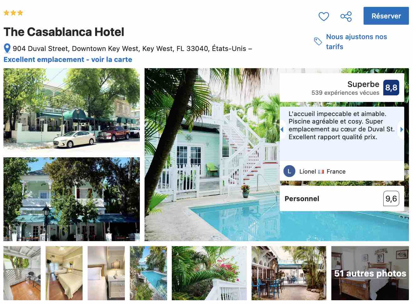 Le premier : The Casablanca Hotel, une chambre d’hôtes de standing de style colonial avec piscine sur Duval Street très appréciée par les voyageurs. Une ambiance qui rappelle d’ailleurs le logement d’Hemingway situé à quelques pas seulement !