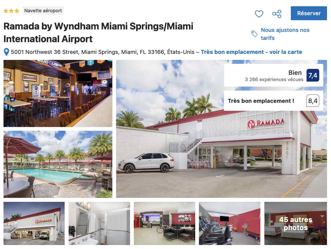 Quoiqu’il en soit, si vous suivez mes conseils, je vous recommande un hôtel basique, pas cher et facile d’accès, comme le Ramada by Wyndham Miami Springs au nord de l’aéroport. Les prix sont raisonnables (environ 130€ la nuit), et l’établissement est propre et confortable. En plus, le petit déjeuner s’avère copieux et vous pourrez faire un plouf dans la piscine.