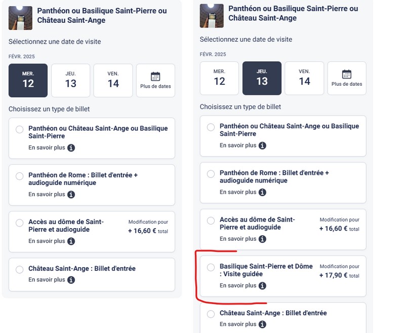 Si dans la date choisi vous n’avez la Basilique Saint Pierre qui est proposé c’est qu’il n’y a plus de place disponible sur le site/prestataire. Mais n’hésitez pas à sélectionner une autre date, exemple: