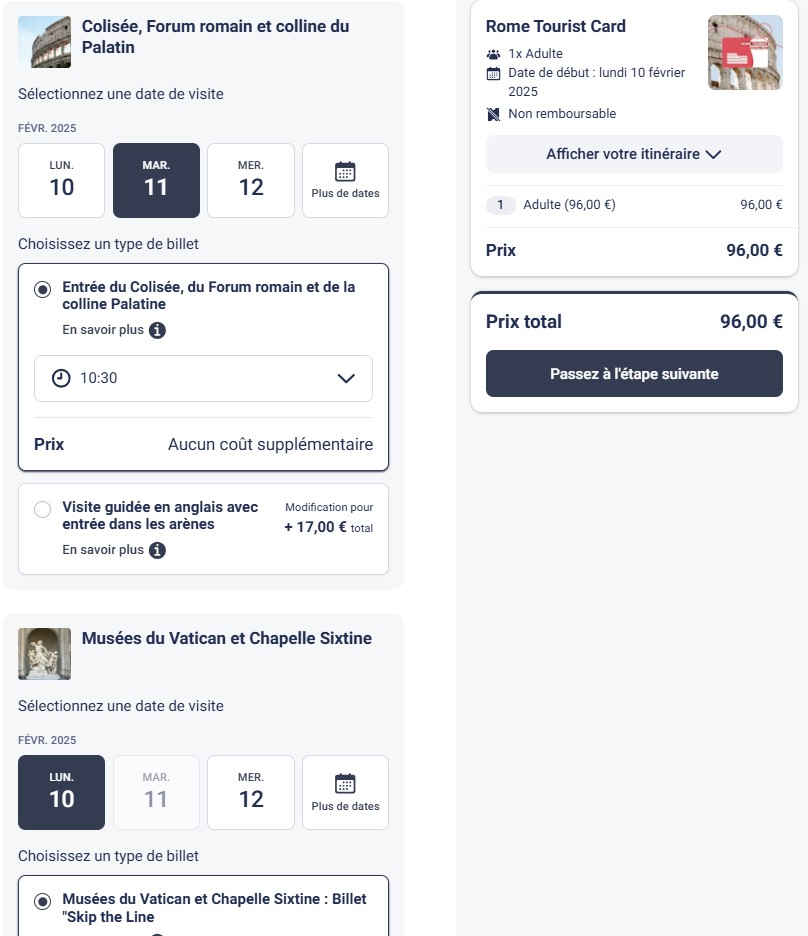 Alors lorsque vous allez acheter le Rome Tourist Carte (lien), avant même de payer quoique ce soit, on vous donnera des dates et créneaux horaires à sélectionner. Et oui vous pouvez sélectionner des jours différents, par exemple prendre le Vatican le lundi et le Colisée le mardi et la Basilique Saint Pierre le Mercredi ou le lundi à la suite de la visite du Vatican. Voir exemple affichage ci-dessous: