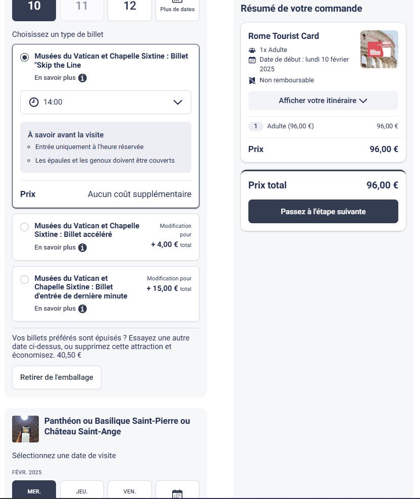 Et enfin vous pourez sélectionner la date et l’horaire du dernier site touristique disponible le Rome Tourist Card c’est à dire, soit le Panthéon, le Château Saint-Ange ou la Basilique Saint-Pierre. Moi je conseille la basilique Saint Pierre car il y a beaucoup moins de monde au Panthéon et au château Saint-Ange.