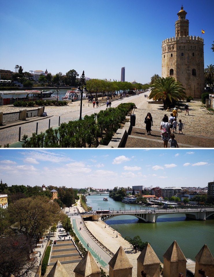 Pour la petite histoire, cette tour était le coffre fort de Séville, là où on enfermait l’or d’Amérique du Sud (d’où son nom la tour d’or). Cette tour jouait aussi un rôle important dans la défense de Séville. En effet, elle était rattachée à l’Alcázar par des fortifications.