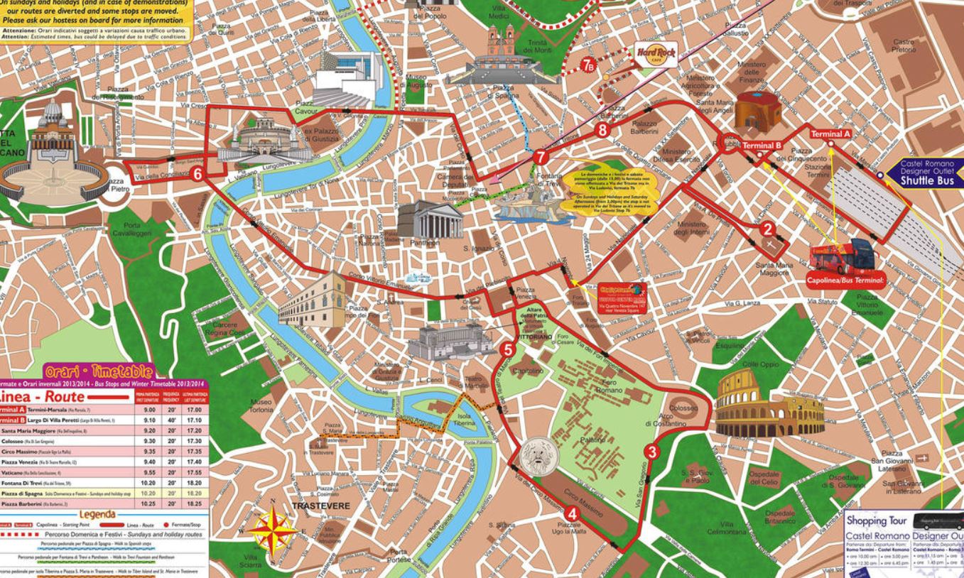 Via Ludovisi Via Veneto – Barberini Square – Termini Train Station – St. Mary Major Esquilino – Colosseum – Circo Massimo Bocca della Verita – Marcello Theater Venezia Square – Capitonline Hill – Vatican City – St. Angela Bridge Navona Square – Via del Tritone Trevi Fountain
