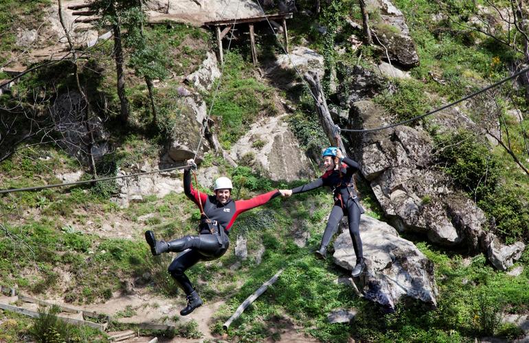 Si vous choisissez l’Aérocanyon Ad’, vous marcherez également 15 minutes avant d’accéder au parcours, qui est réservé aux ados et adultes. Il y a deux sauts supplémentaires par rapport au parcours « Canyoning 5+ » et un rythme plus sportif.