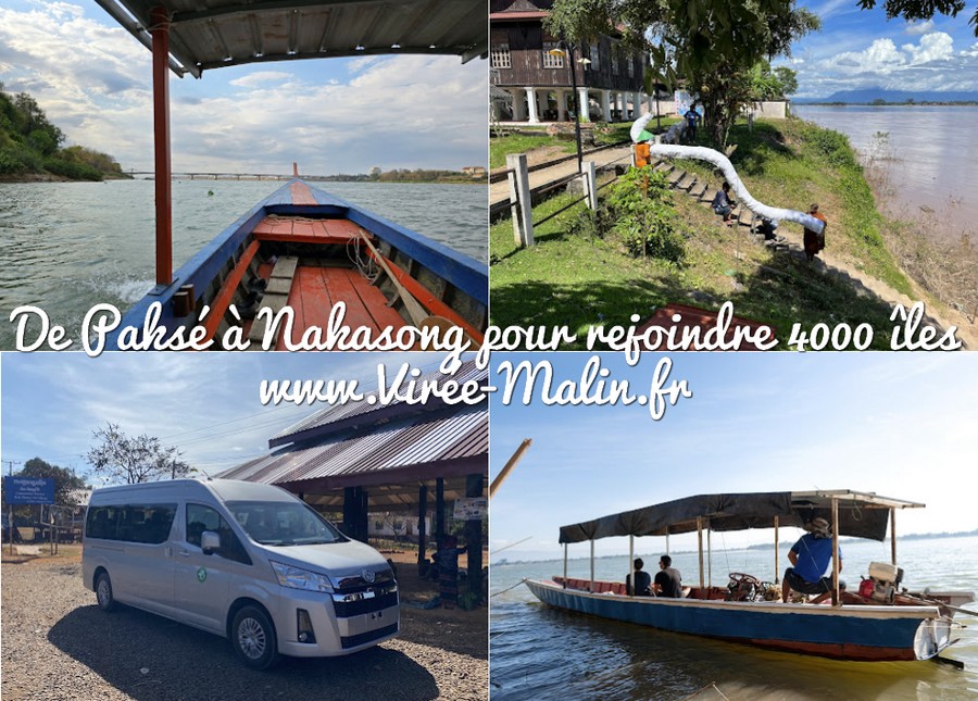 Le parcours se fait généralement en minivan jusqu’à Nakasong, puis en petit bateau qui vous dépose sur l’île où vous avez choisi de séjourner (souvent Don Det, Don Khone ou Don Kong mais je ne conseille pas cette dernière). Le trajet complet (van + bateau) est pris en charge par les compagnies et coûte en moyenne 180 000 kips, soit environ 8 € par personne. Comptez environ trois heures de voyage au total depuis Paksé.