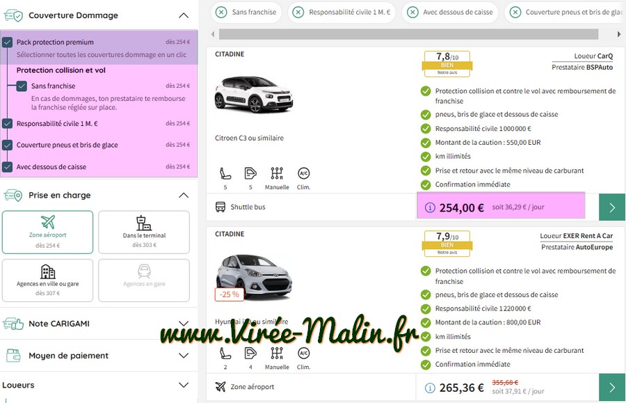 Exemple de prix pour une voiture de location du samedi 16 Aout au samedi 23 Aout avec le même pack assurance tout compris: Comptez 372€ soit 53€/jour, là oui c’est beaucoup plus cher mais vous êtes en plein mois d’Août.