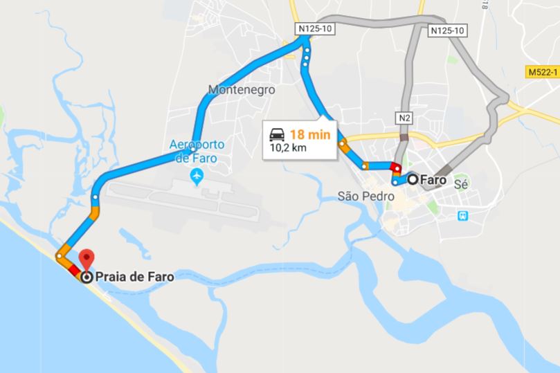 Alors oui, les plages ne sont pas à côté des logements, et il vous faudra faire 15 minutes en bus ou en bateau. Mais si vous devez passer au moins une nuit sur place avant de partir visiter la région de l’Algarve, je vous conseille de trouver un logement dans la zone violette ci-dessous, je vous donne des adresses d’hôtel juste en dessous de cette map. J’ai écrit un article complet à ce sujet, n’hésitez pas à le consulter : « Où dormir à Faro« .