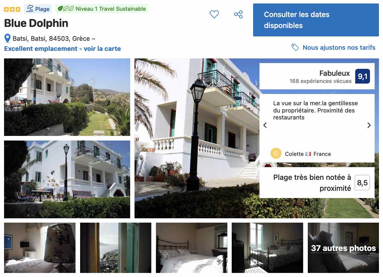 Quelques dizaines de mètres plus au nord, vous avez aussi le Blue Dolphin, une charmante maison d’hôtes qui a l’avantage, outre le confort des chambres, de vous offrir un cadre naturel splendide et une des plus belles vues sur Batsi. Si vous êtes venus chercher le calme et la relaxation, c’est ici que je vous recommande de réserver votre séjour sur l’île d’Andros.