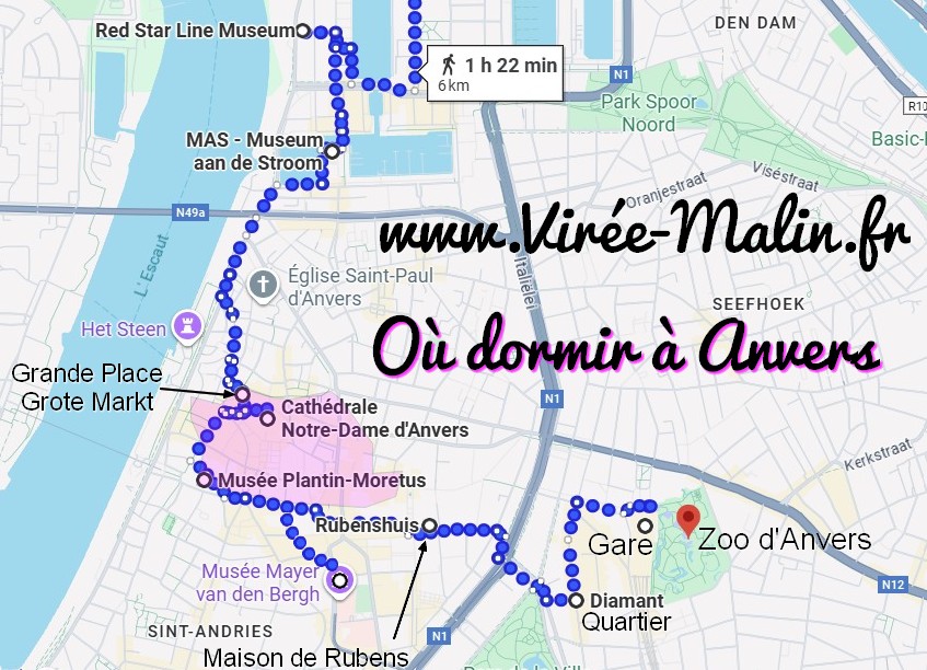 Comme toujours, voici une carte que j’ai personnalisé pour vous et qui vous permet de voir les incontournables touristiques à faire lors de votre visite à Anvers. Je vous ai aussi mis en violet la zone où trouver votre logement afin d’être idéalement situé.