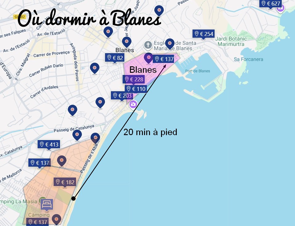 Je vous conseille de dormir dans la zone violette et non dans la zone orange (qui est trop excentrée à mon goût). C’est dans la zone violette que vous trouverez le plus de vie, de boutique, et puis c’est le centre historique de Blanes, donc plus charmant.
