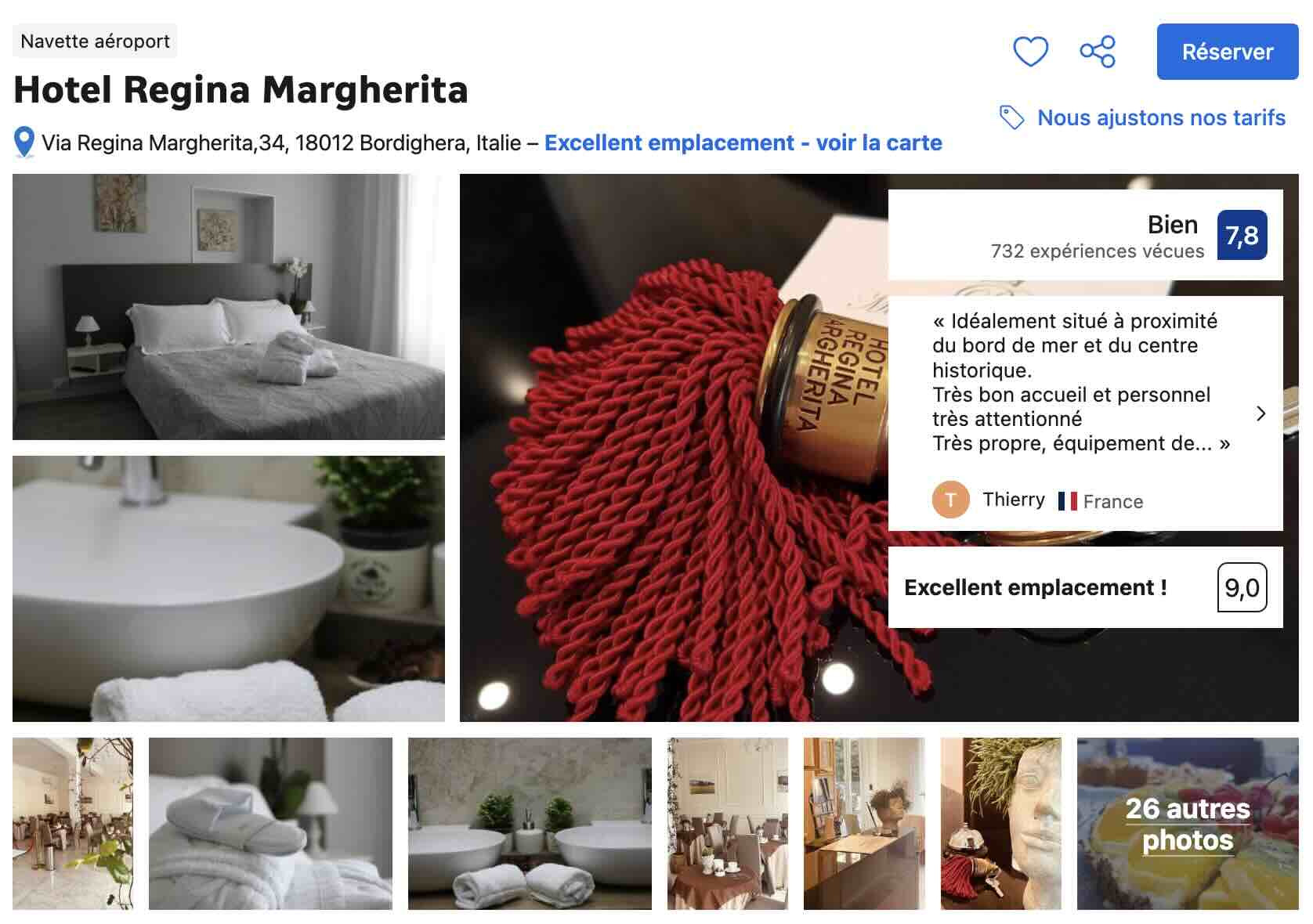 Le premier établissement que je vous recommande est l’hôtel Regina Margherita qui se situe en plein cœur de ville et à moins de 5 minutes de marche du bord de mer. Un emplacement de choix pour poser vos valises à Bordighera avec des chambres spacieuses à moins d’une centaine d’euros pour deux personnes.