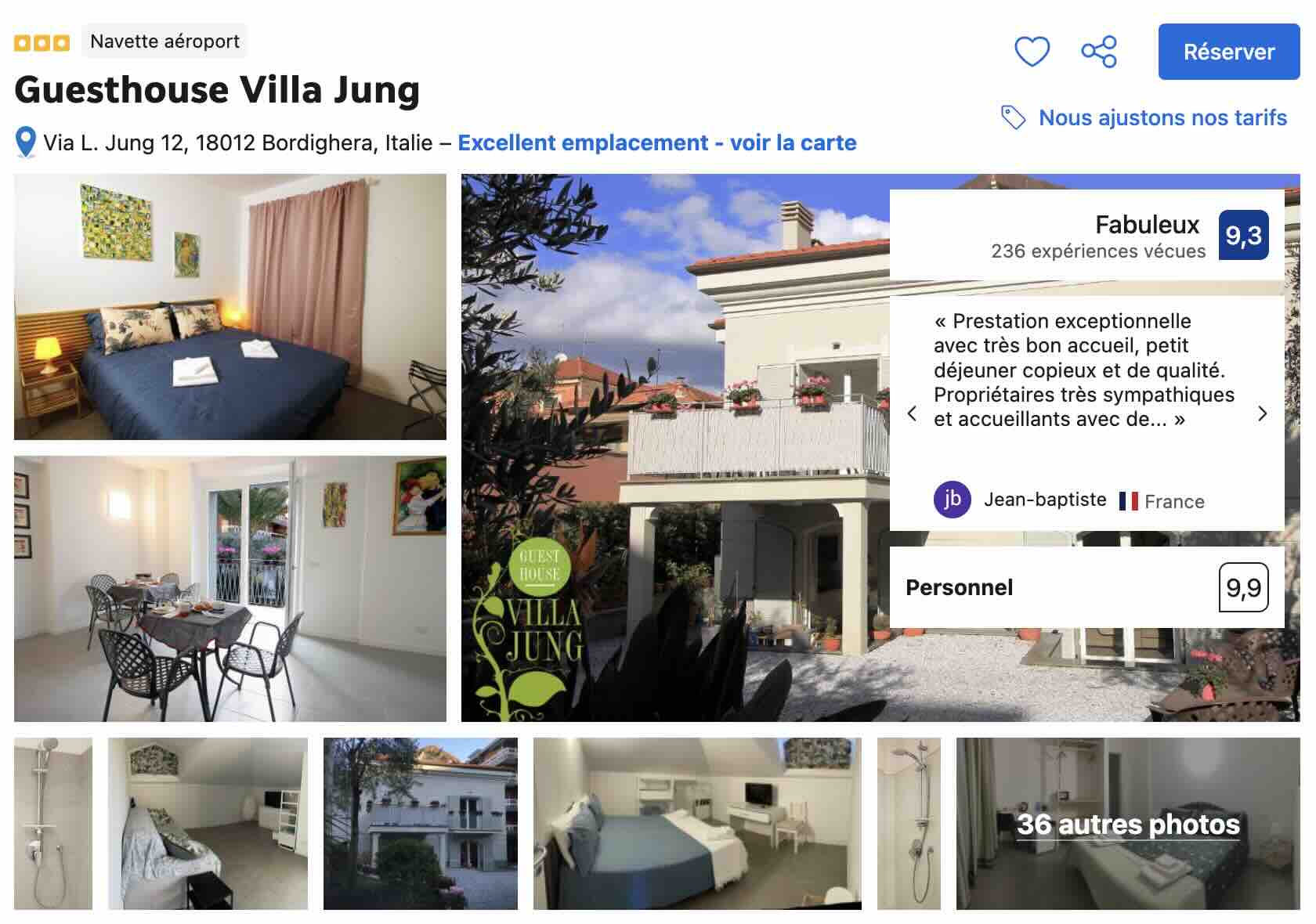 À quelques pas de cette adresse, en vous rapprochant du littoral, vous avez aussi la Villa Jung, une maison d’hôtes qui propose des chambres pouvant accueillir jusqu’à quatre personnes. Un hébergement idéal si vous voyagez en famille ou pour un séjour à Bordighera entre amis. Pour information, la plage principale se situe à moins de 200 mètres de votre logement.