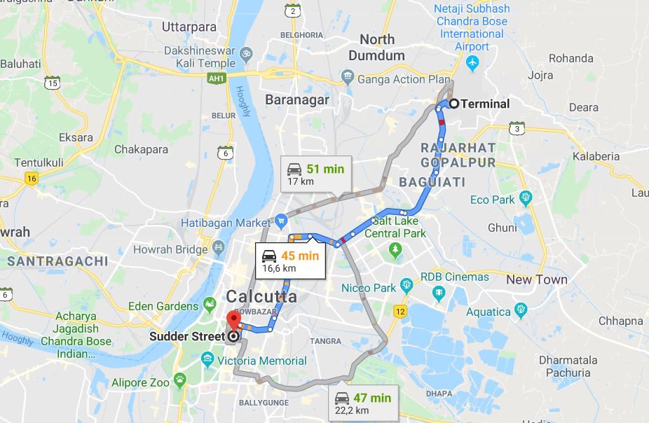 - Cliquez ici pour agrandir cette GoogleMap – Rejoindre Calcutta depuis l’aéroport :