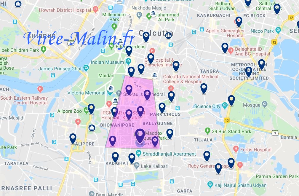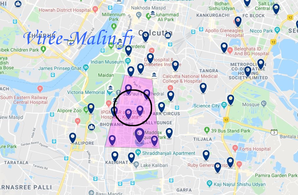 Que vous choisissez le quartier de Park Street ou celui de Hazra, ces deux quartiers se touchent et se trouve dans la zone violette ci-dessous (et plus particulièrement dans le cercle noir), voilà pourquoi c’est ici que je vous conseille de loger à Calcutta pendant votre séjour.