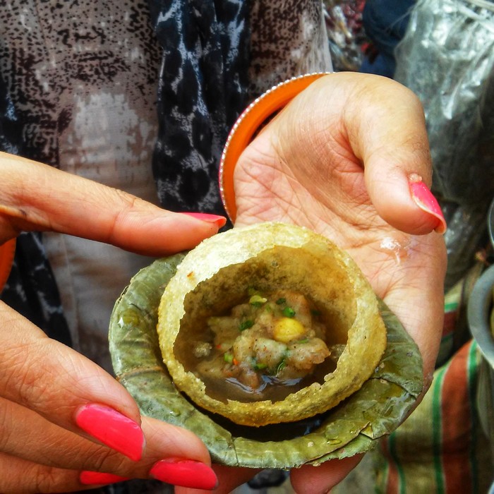Phuckha : Constitué d’un puri ovale creux et frit que l’on mange avec de l’eau assaisonnée, du chutney de tamarin, du piment, du chaat masala, des pommes de terre, des oignons et des pois chiches.