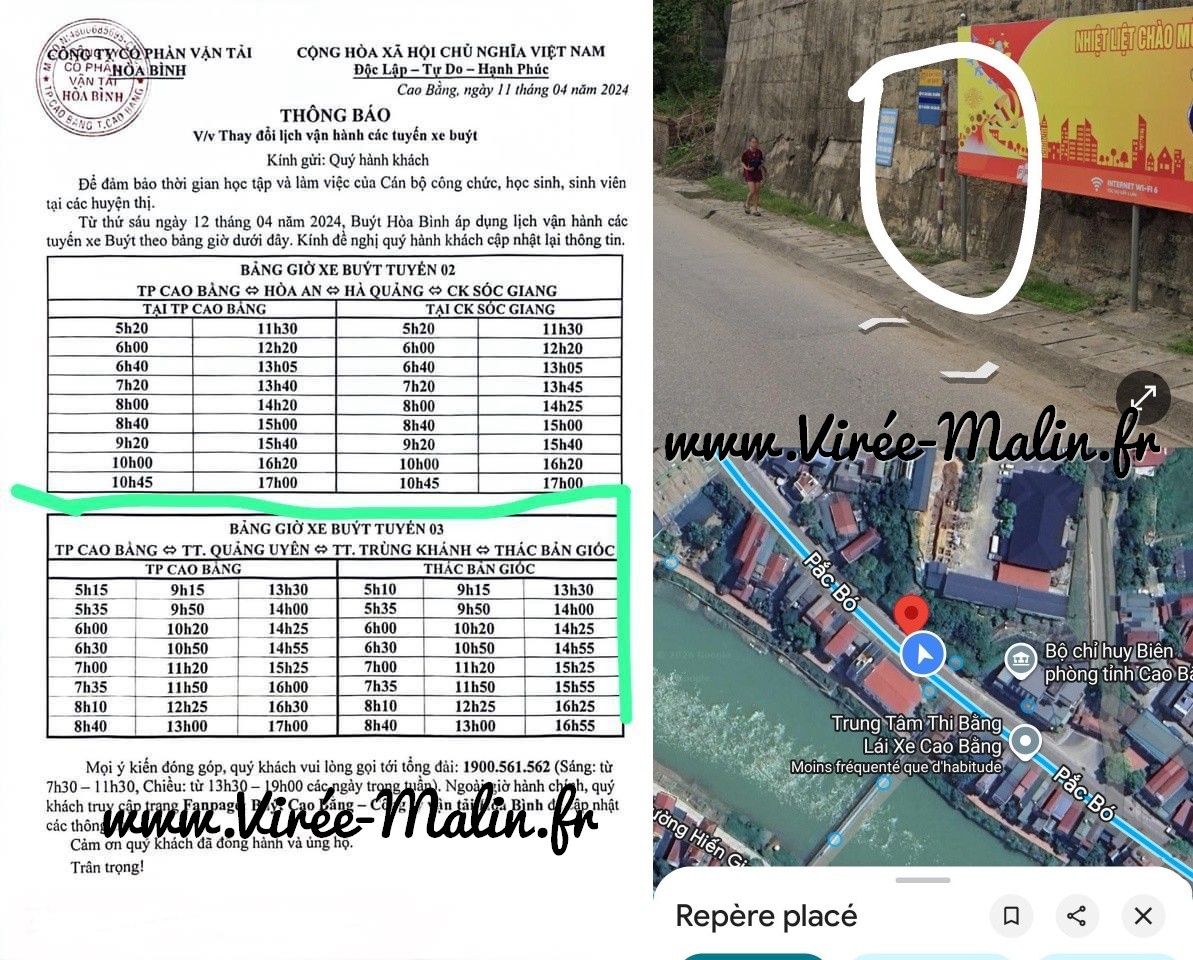 Puisque des images valent mieux que 1000 mots, voici les horaires (zone encadrée en vert) et l’arrêt de bus). À gauche du tableau en bas, ce sont les horaires depuis Cao Bang et à droite les horaires pour le retour, depuis Ban Gioc :