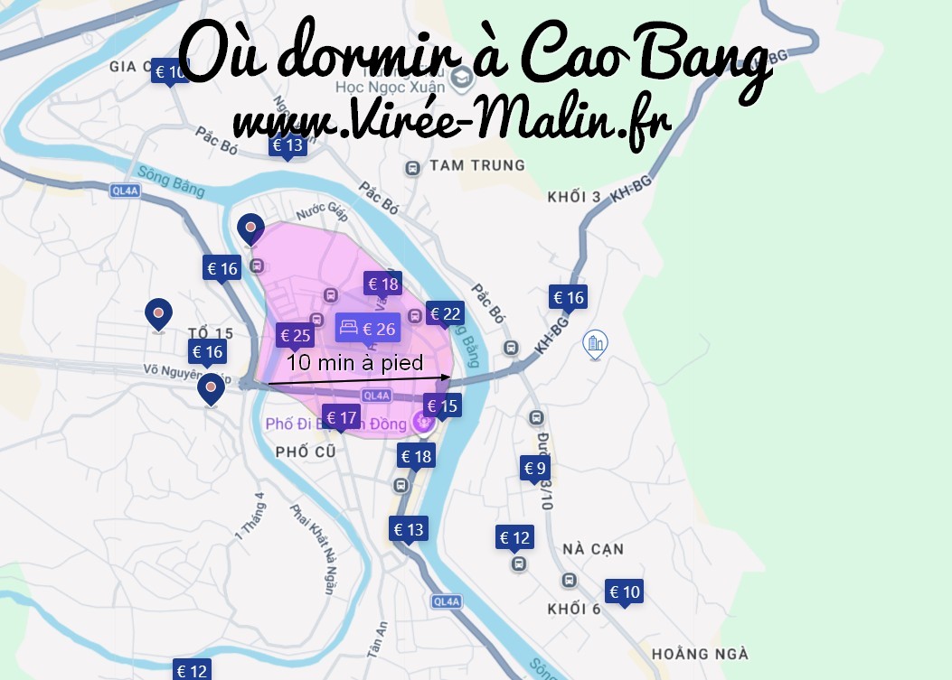 Je vous conseille dans tous les cas de loger dans le centre ville de Cao Bang ou du moins proche, surtout pour faciliter l’accès aux restaurants le soir. Cliquez ici pour voir les logements encore disponibles dans la zone violette, car c’est ici le centre centre de Cao Bang, c’est ici que je vous conseille de dormir sans hésiter (lien Booking.com):