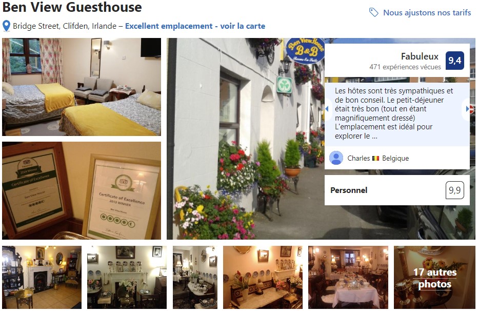 Une autre bonne adresse et en plein coeur du centre ville de Clifden c’est le Ben View Guesthouse, une petite adresse vraiment typique Irlandais. Lisez les avis ;)