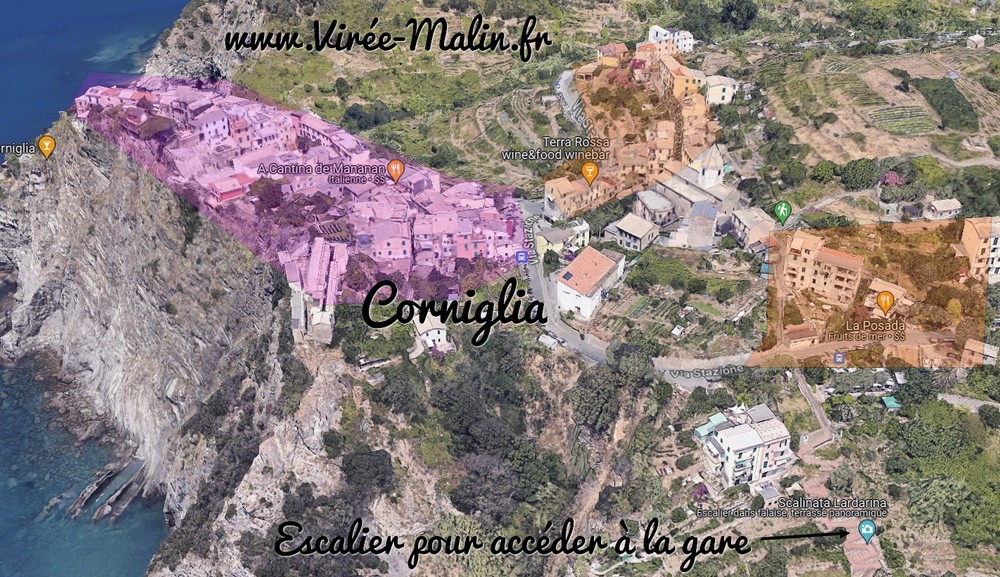 En violet vous avez la zone qui représente le cœur historique de Corniglia et les zones oranges représentent des zones faciles d’accès (pas de montée, le chemin est plat et vous êtes entre 3 et 5 minutes de marche de la zone violette, donc ce sont aussi des lieux où vous pouvez réserver votre logement).