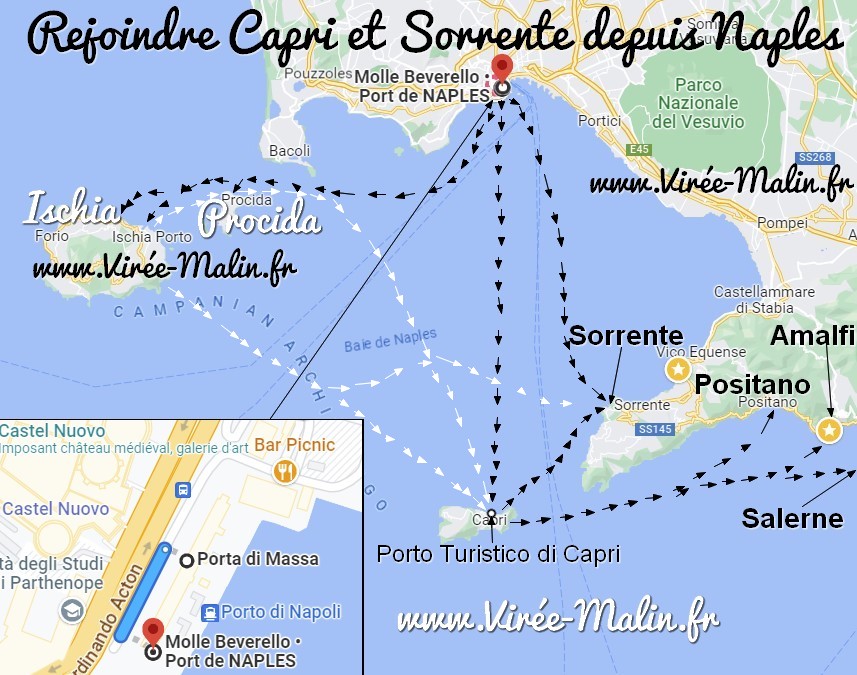 Depuis Sorrento vous pouvez rejoindre Capri, Positano et Amalfi en bateau. D’ailleurs si vous décidez de ne pas louer de véhicule sachez que vous pouvez rejoindre Sorrento depuis Naples en bateau aussi!