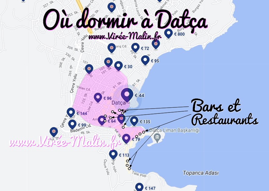 - Cliquez ici pour voir les logements via Booking qui se trouvent dans la zone violette (le cœur historique de Datça), vous serez idéalement situé!