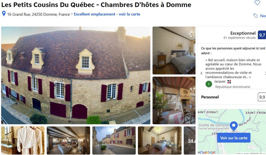 Une dernière adresse qui se trouve au coeur du périgord Noir et qui est proposé par Daniel et Stéphanus. Ils vous invite à passer deux nuits dans leur magnifique établissement qu’ils ont appelé les chambres d’hôtes « Les Petits Cousins Du Québec ». Vous serez accueillis dans leur magnifique maison dans un cadre chaleureux, des petits déjeuners incroyables et des conseils pour visiter Domme et sa région.