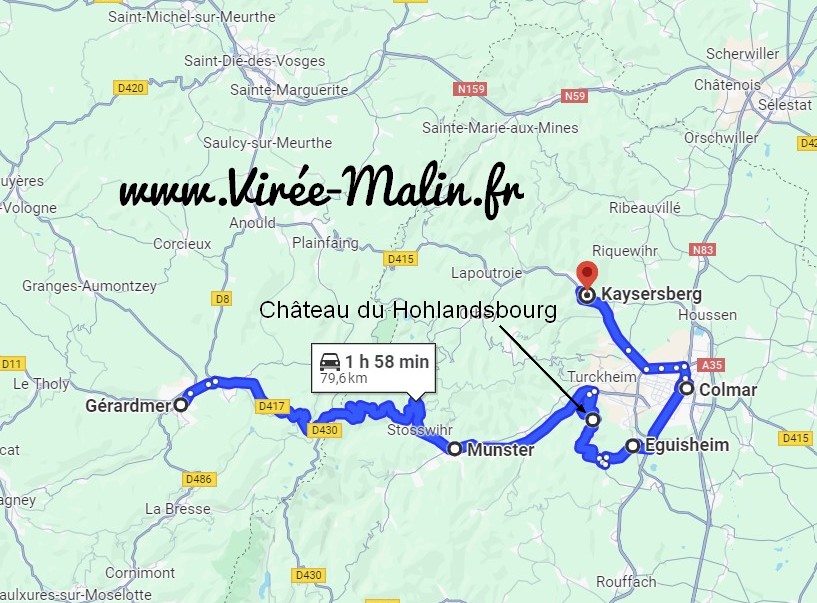Au Nord de Riquewihr vous avez cette route des vins d’Alsace à suivre (Ribeauvillé, Bergheim, Saint-Hippolyte, Kintzheim, Châtenois, Dambach-la-ville, Andlau, Barr, Ottrott, Obernai):
