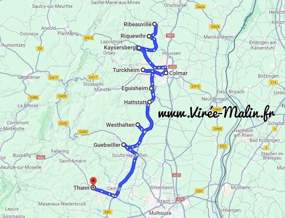 Au Sud de Riquewihr voilà une route des vins d’Alsace à suivre (Thann, Guebwiller, Westhalten, Hattstatt, Eguisheim, Turckheim, Kaysersberg, Riquewihr, Ribeauvillé) :