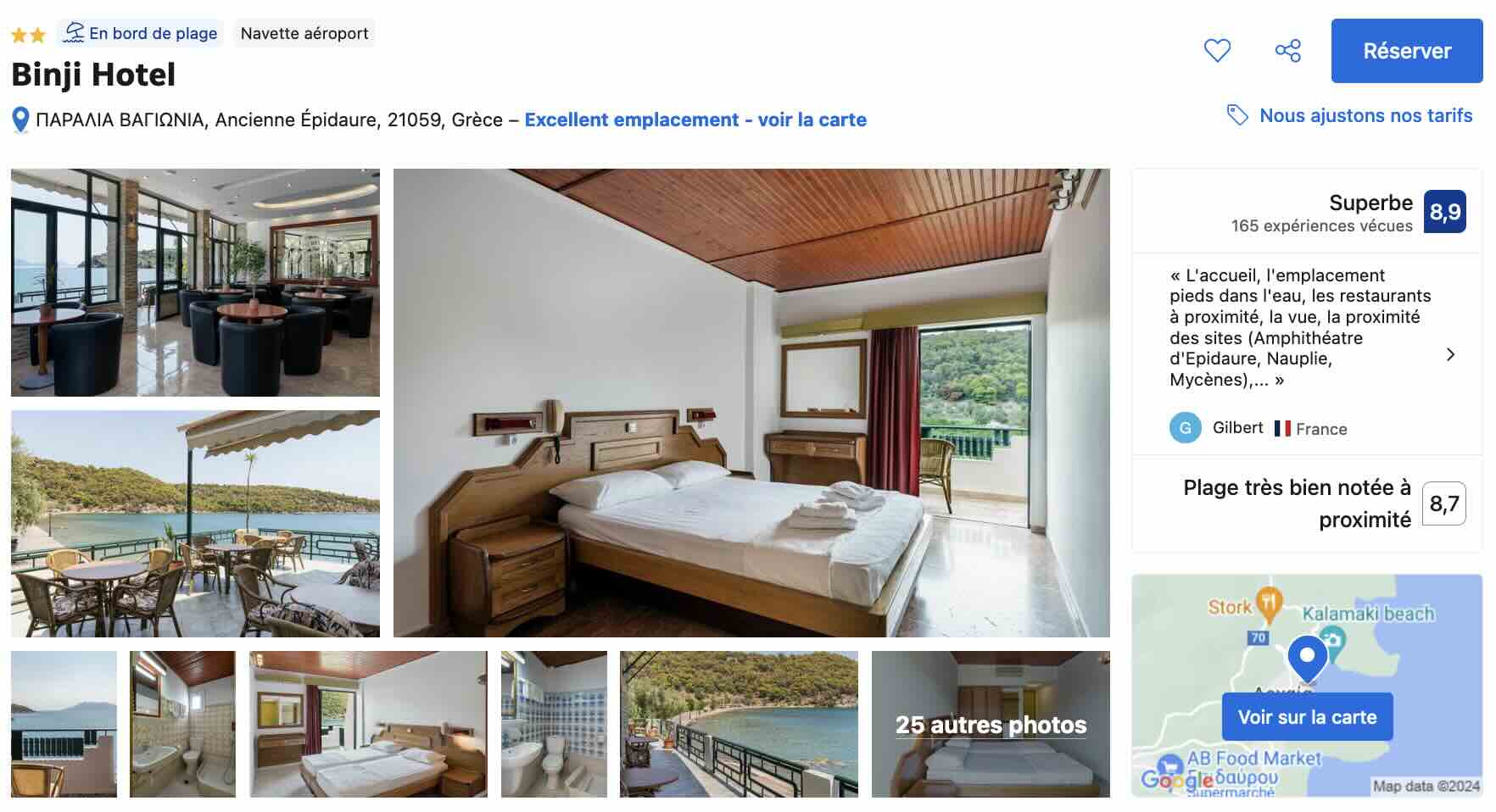 Restaurant, service d’étage, parking gratuit, salle de sport, vente de billets pour les excursions et la visité du site antique d’Epidaure… Tout est réuni pour un séjour agréable. D’autant plus que le tarif est très raisonnable avec une chambre vue mer et petits déjeuners inclus à partir de 55 euros.